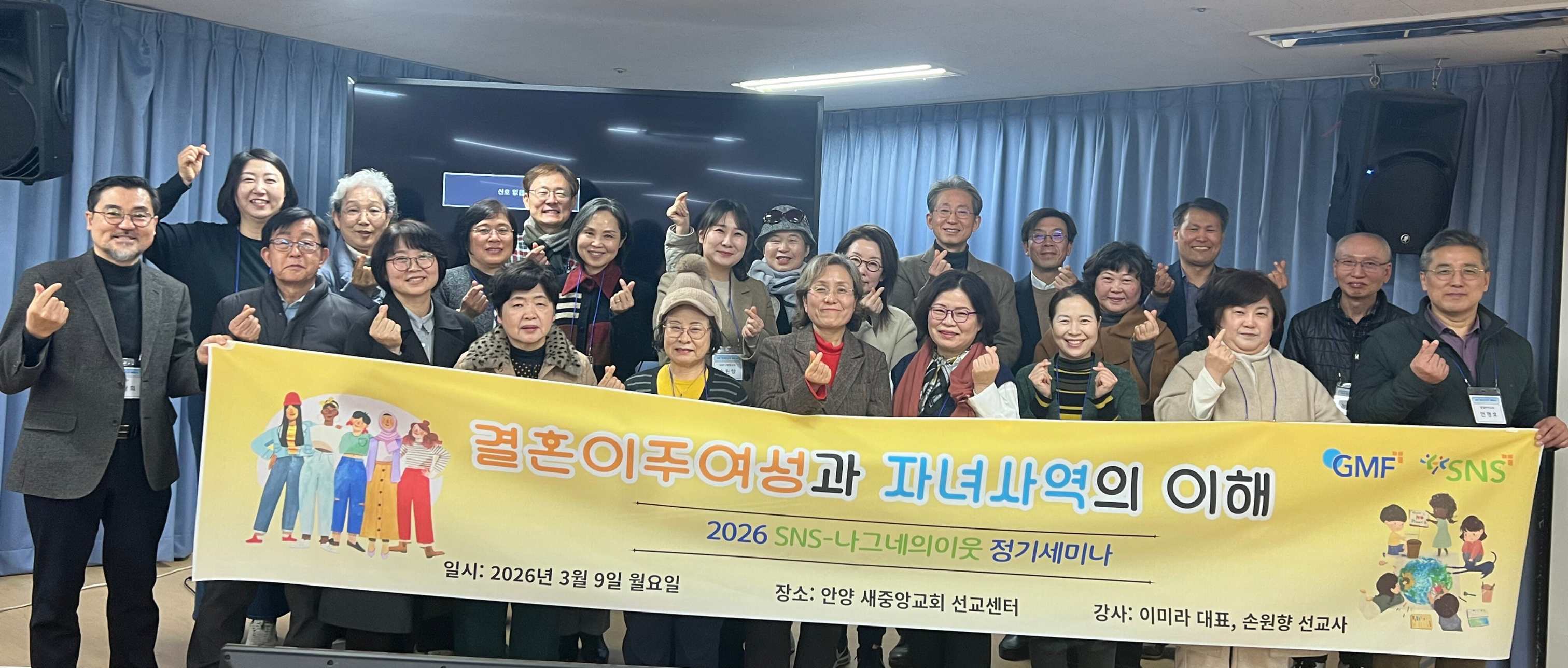 SNS-나그네의이웃이 2026년 첫 사역의 시작으로 3 9일 개최한 이주민선교 정기 세미나가 현장과 온라인 참석자들의 적극적인 참여 속에 은혜 가운데 마무리됐다이번 세미나는 '결혼이주여성과 자녀사역'을 주제로 열렸으며현장과 온라인(Zoom) 각각 30여 명이 함께 해 예상보다 많은 관심을 모았다. (주)메이커스 이미라 대표가 강사로, GMP 손원향 선교사가 진행을 맡았다예배와 찬양기도강의토의기도회광고와 식사 교제로 이어진 순서 속에서 참석자들은 실제 현장의 고민과 사역의 방향성을 함께 나누는 시간을 가졌다.